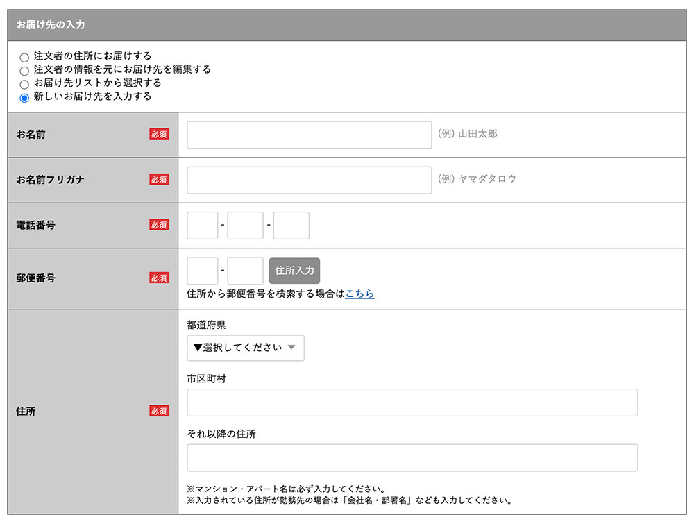 ご注文者さまのご住所以外に商品をお届けする場合は、ご注文お手続き画面の「お届け先の入力」欄にご記入ください。
