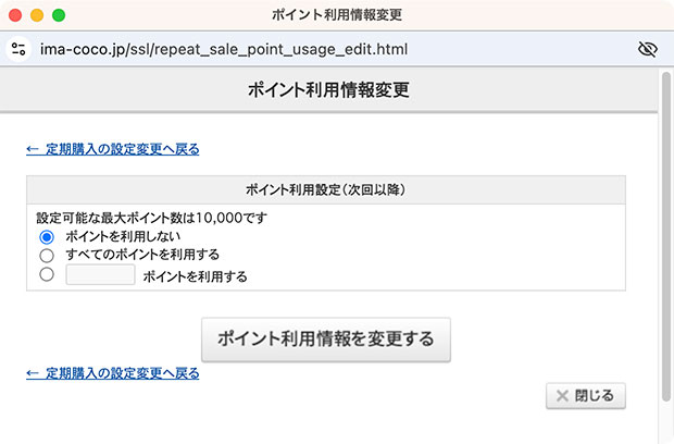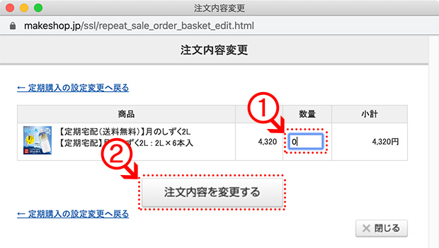 設定の変更を行わない場合には、← 定期購入の設定変更へ戻るで戻れます。