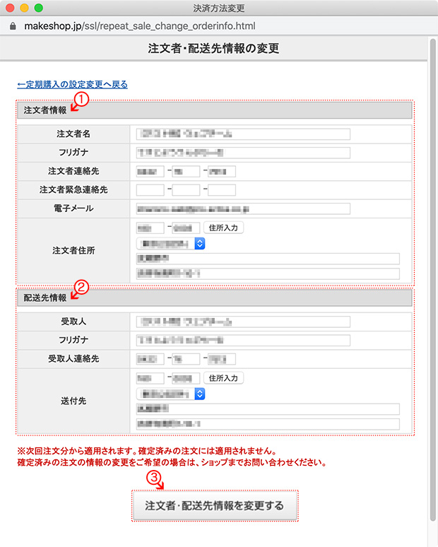 変更されたい項目の入力が終了しましたら、(3)「注文者・配送先情報を変更する」ボタンのクリック(タップ)で確定してください。確認後、変更が完了すると表示は自動的に「定期購入の設定変更」に戻ります。