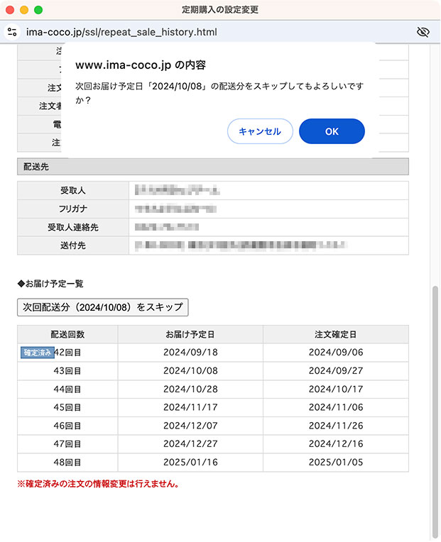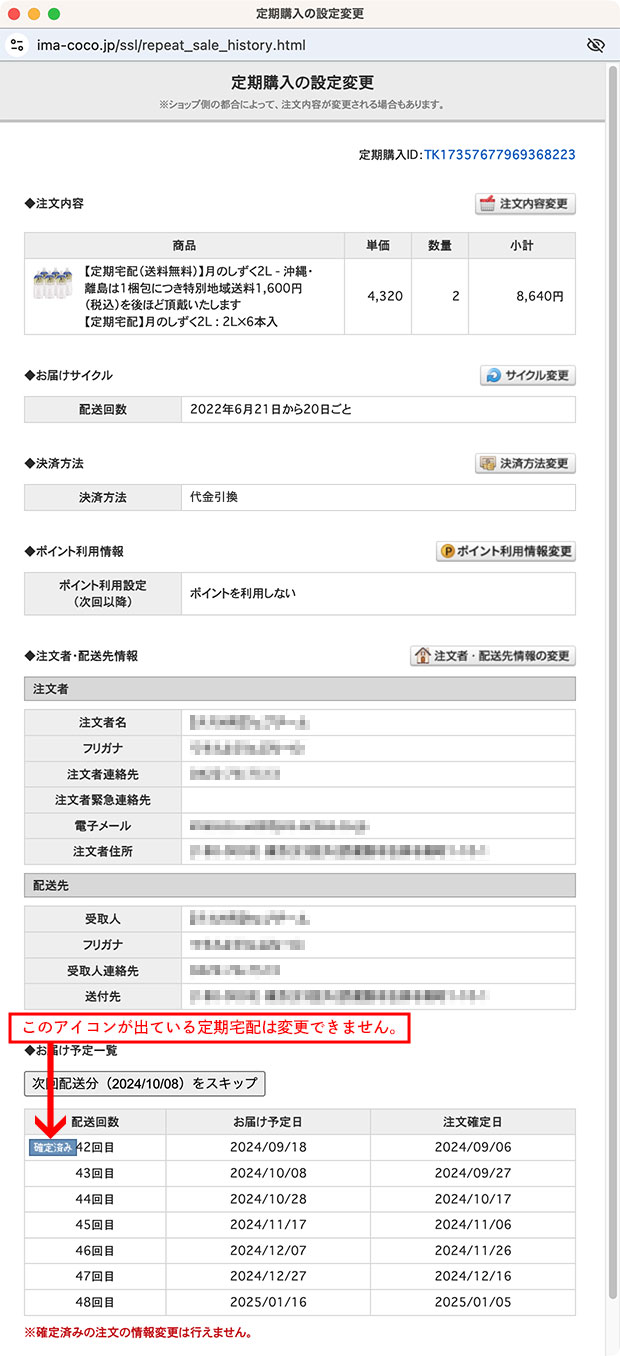 定期購入の設定変更で、お届け予定一覧に「確定済み」のアイコンがついている分につきましては、「注文確定」となっており、変更できませんのでご了承ください。