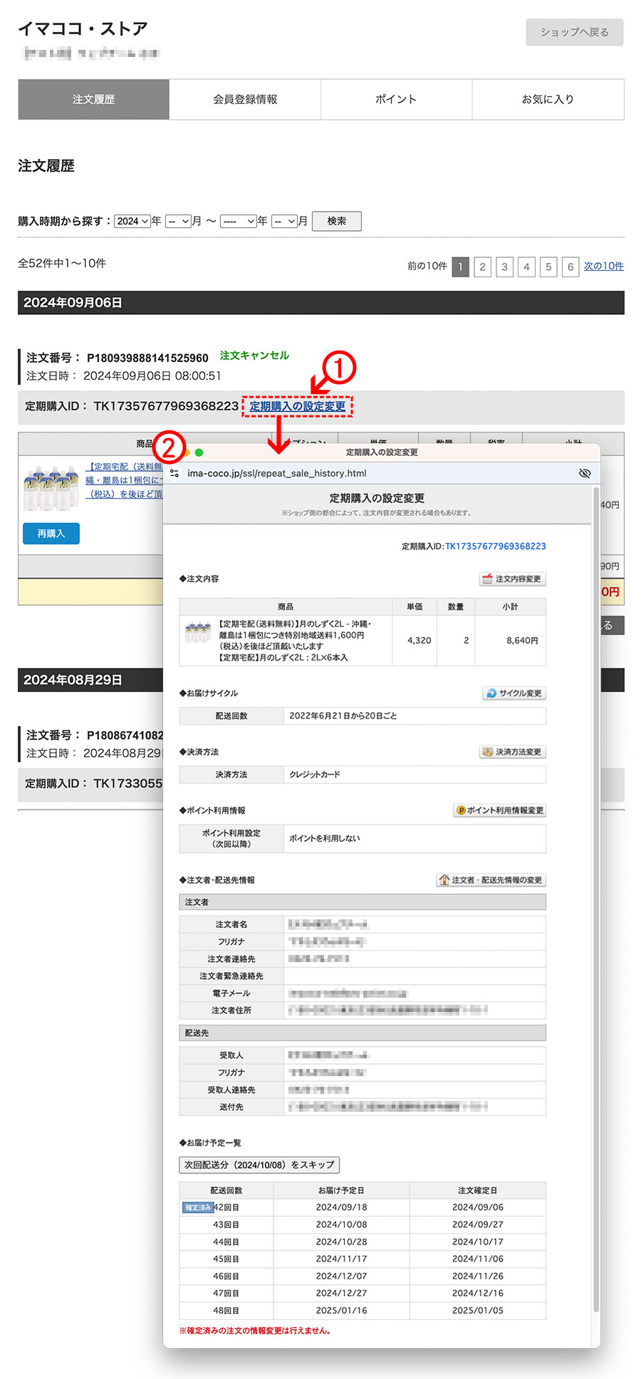 定期購入IDの横にある(1)定期購入の設定変更をクリック(タップ)すると、(2)定期購入の設定変更が開きます。