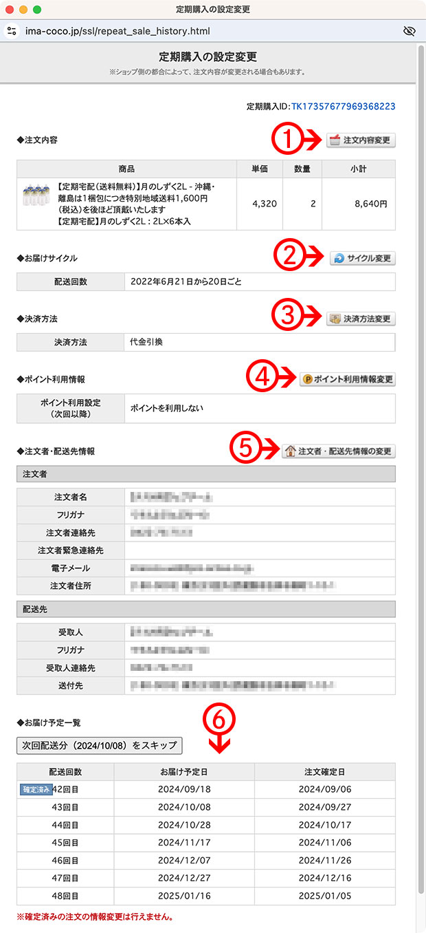 確定済みの注文情報の変更は行えませんが、まだ注文確定日に到達していない定期宅配は、以下の項目について変更が可能です。
