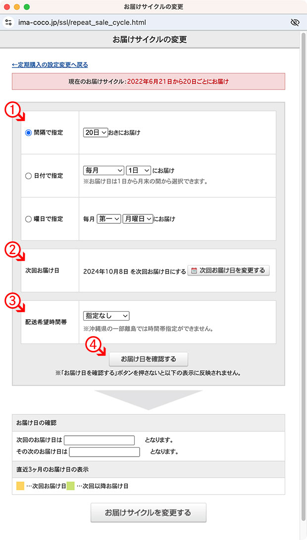 間違っている場合は、(1)日付で指定または(2)次回お届け日に戻って、設定を見直してください。