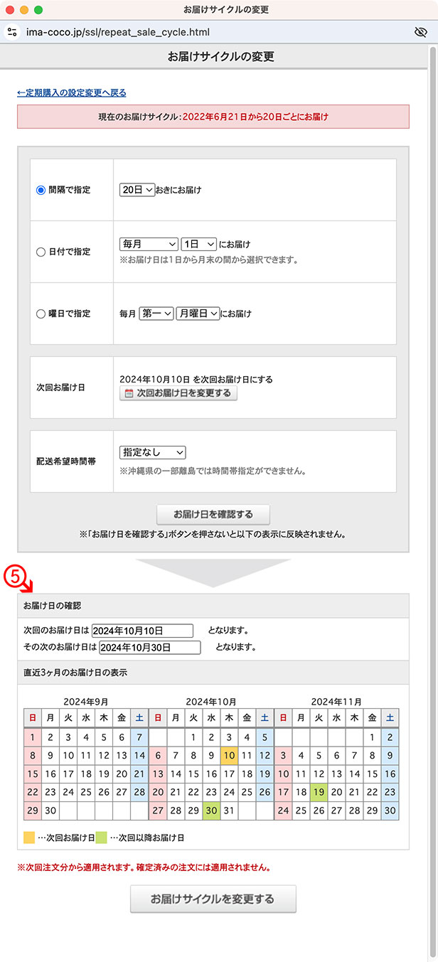 「お届けサイクルを変更する」ボタンをクリック(タップ)して、お届けサイクルの変更を確定してください。