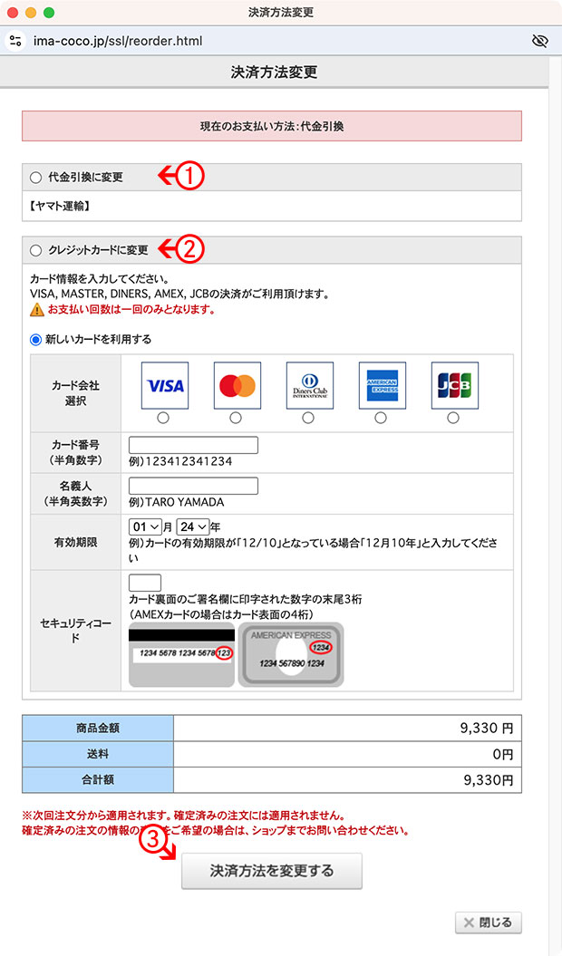 (2)クレジットカードに変更する際に、カードが未登録の場合には、新しくカードの登録が必要になります。