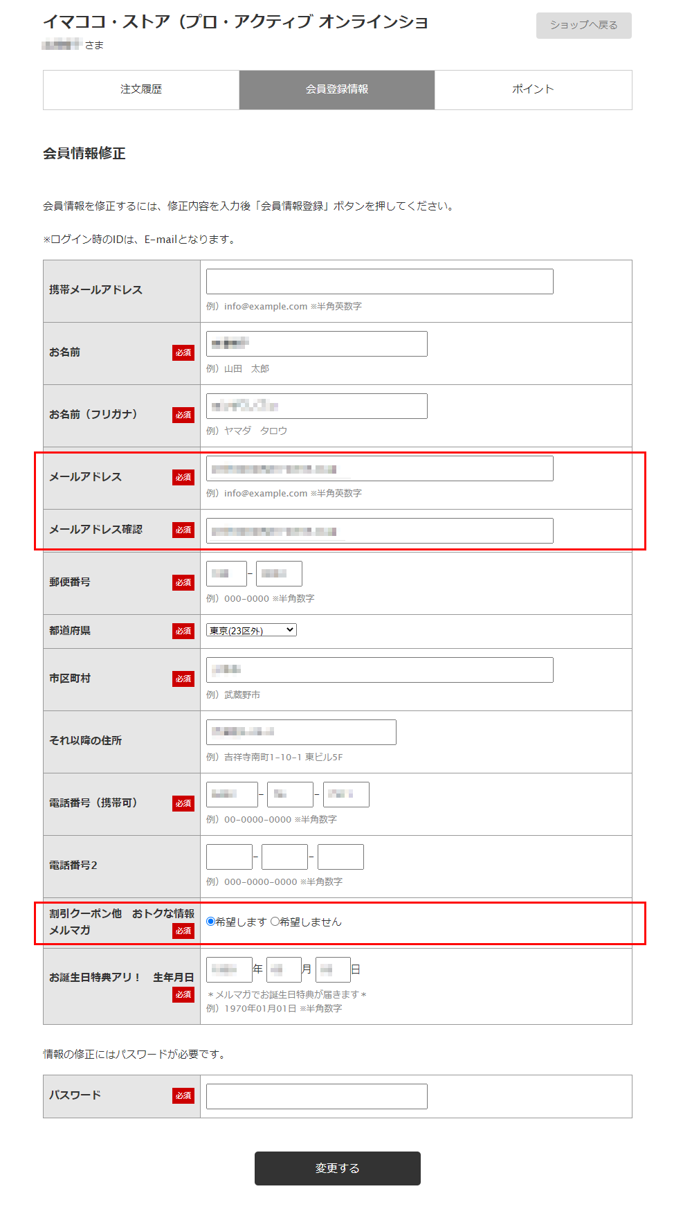 新しいメールアドレスを直接ご入力いただいて「変更」を押すことで、メールアドレスのご変更も可能です。「割引クーポンなどお得な情報メルマガ」の項目が「希望します」が選択されているかを、併せてご確認ください。